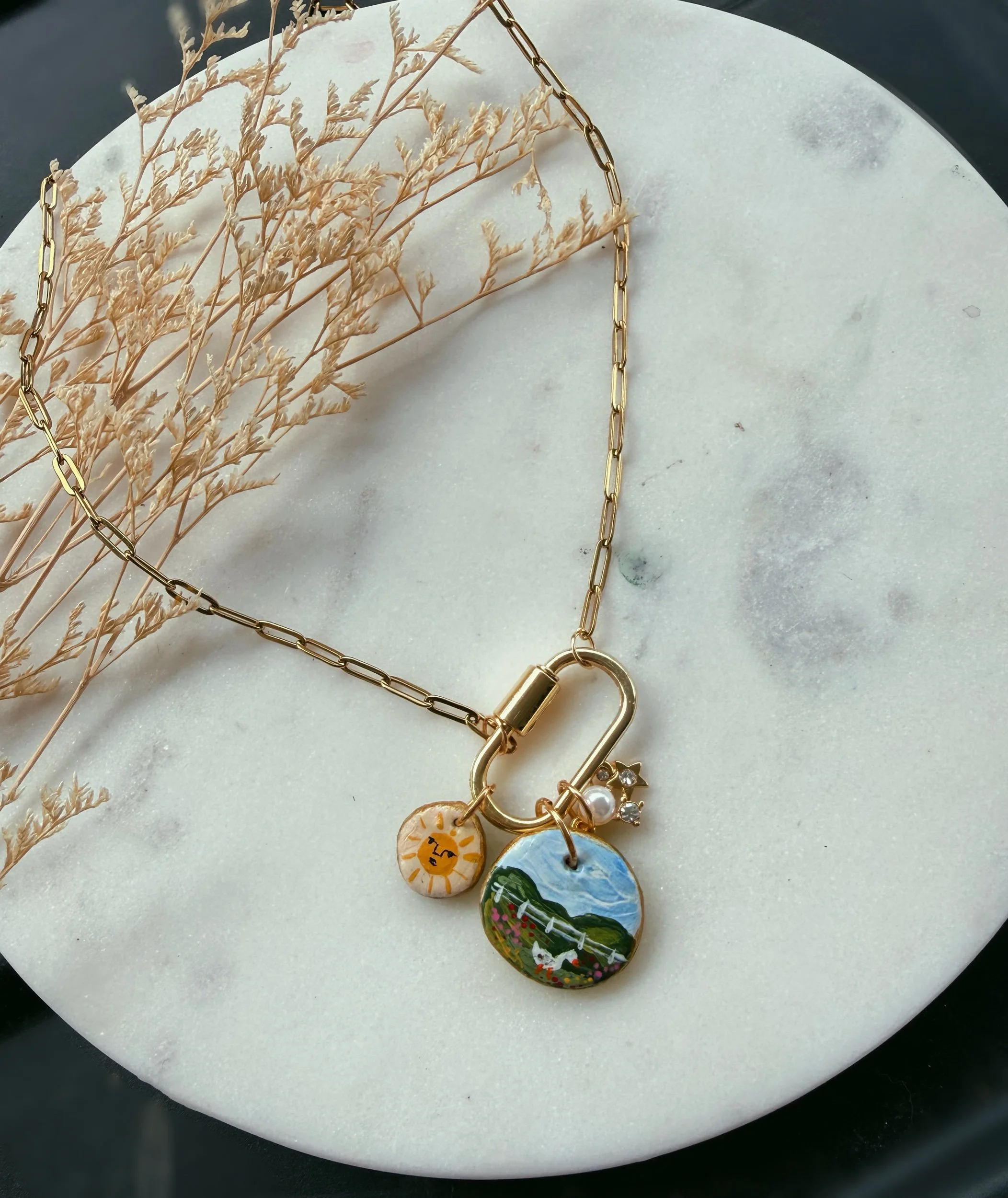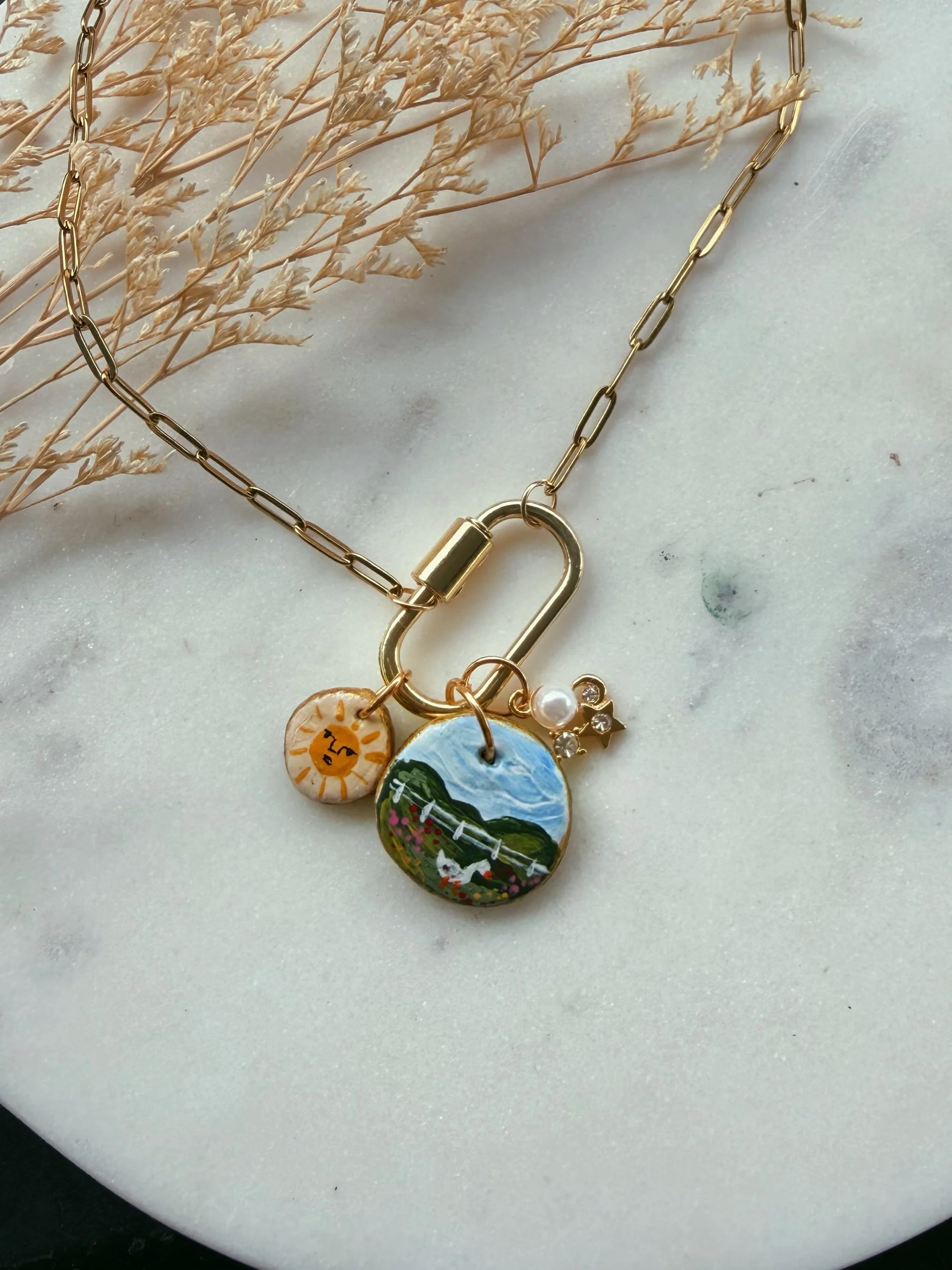 Shop › Goose Lake Image 1 of 3 Image 2 of 3 Image 3 of 3 Goose Lake $40.00 20 inch gold plated chain, with hand sculpted and painted charms. Add To Cart Added! 20 inch gold plated chain, with hand sculpted and painted charms. Reviews Reviewer Name Review Date Star Rating Description Posted on Etsy Product Show More